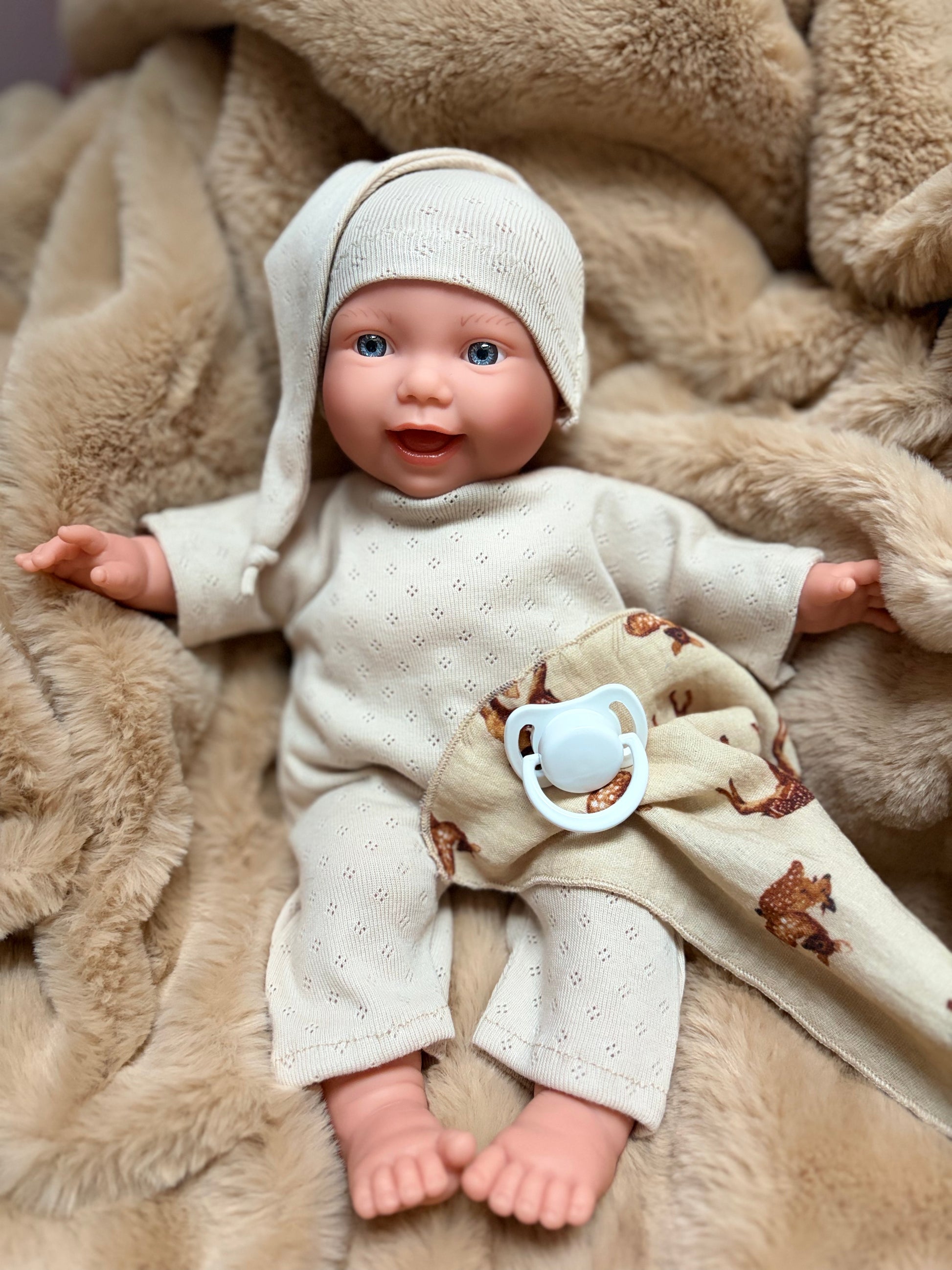 Ses yeux pétillants, son sourire tendre et son petit bonnet de nuit en font un compagnon parfait pour imaginer, câliner et apaiser.